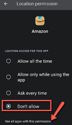 步骤 3) 选择“不允许”以自动限制该应用程序的位置访问,或选择“仅在使用应用时允许”以进行有条件访问。然后,您可以点按“查看具有此权限的所有应用”并更改所有应用的定位设置。