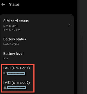 步骤 3)在这里,您会看到列出的 IMEI 号码。有时它可能在“状态”或“手机身份”等子菜单下。