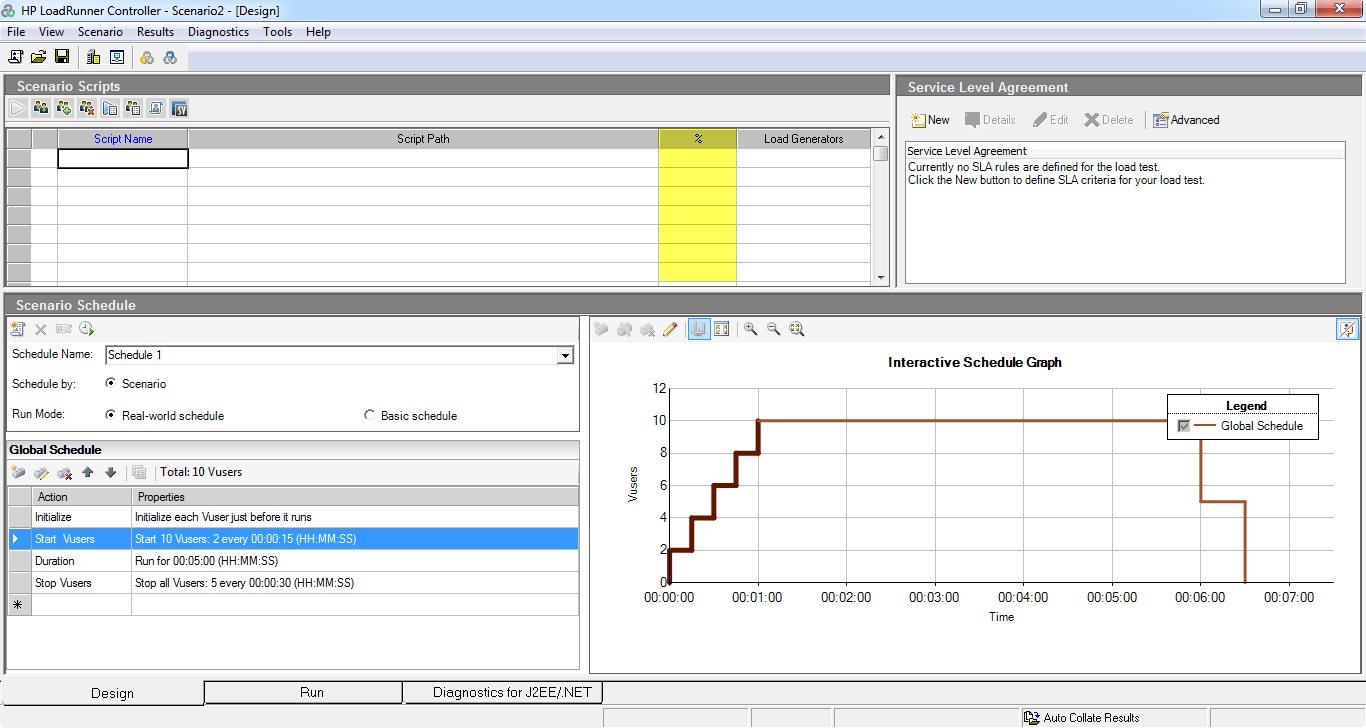 现在您已经创建了一个新的、空白的 LoadRunner 场景,请注意