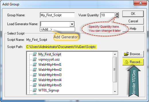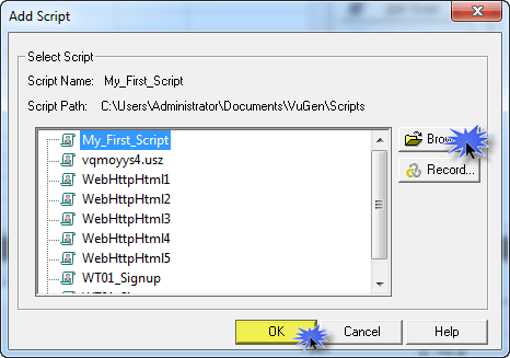 正如您所见,您可以在此处浏览 VUser 脚本、GUI 脚本或 QTP 脚本。请记住,GUI 或 QTP 脚本只能实例化单个用户,不能用于“负载模拟”。您能告诉我为什么 QTP 脚本可以在 Load Scenario 中使用吗?