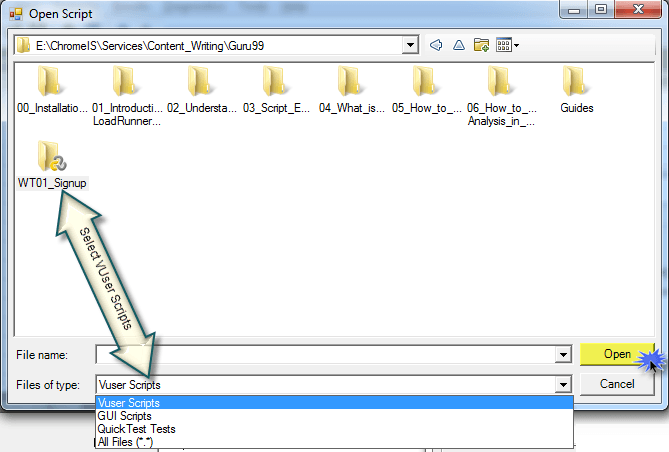 类似地,要打开现有或先前创建的场景,您可以使用 Ctrl + O 或 图标,它将打开一个标准的对话框用于浏览文件。Load Runner 场景文件的扩展名为*.lrs
