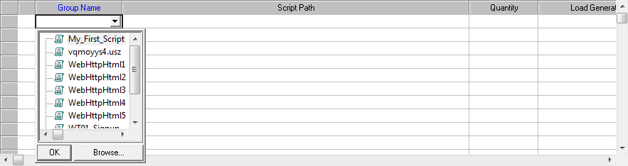 当您单击“组名”列下的单元格时,会打开一个小框,即 – 在这里您可以看到最近的 VUser 脚本的快速列表以及浏览按钮。请参考下图。