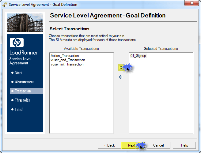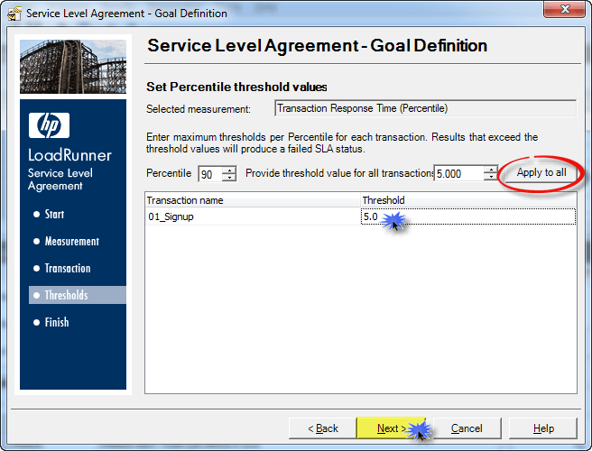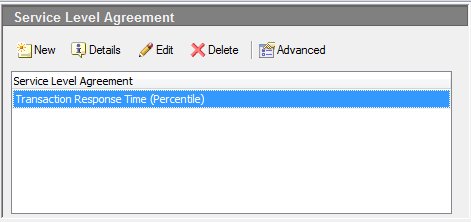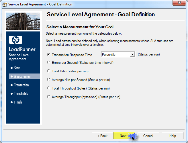注意新窗口。在这里,您可以选择 SLA 的测量。在我们的例子中,我们正在进行事务响应时间。请看