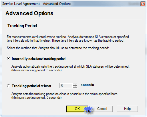 如果您使用“内部计算跟踪周期”,Analysis 会自动设置将确定 SLA 状态的跟踪周期。此选项的最小跟踪周期设置为 5 秒。
