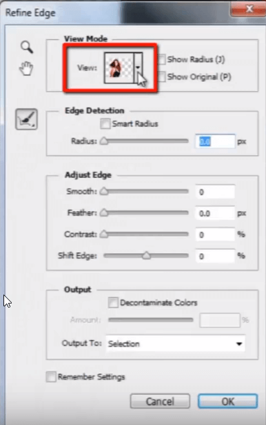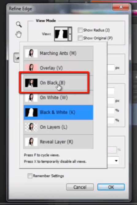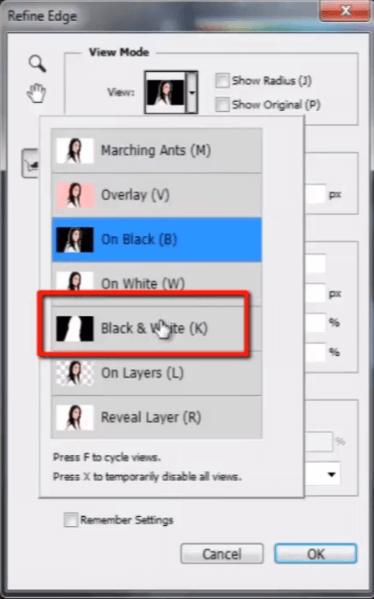 这是细化边缘面板。我将视图模式从“黑白”更改为“黑色背景”。