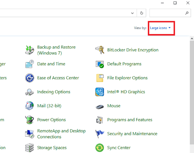 在控制面板中,单击按查看方式下拉菜单,然后选择大图标。