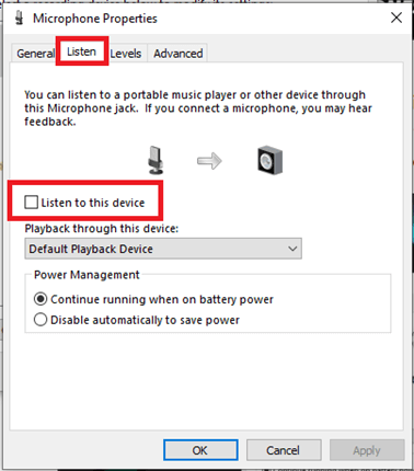 单击收听选项卡,然后勾选收听此设备。这样,您就可以听到耳机麦克风的声音,因为它将您的麦克风输入传回您的耳机。您可以通过取消勾选收听此设备来禁用麦克风监控。