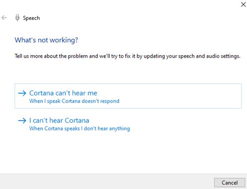 通过选择Cortana听不到我的声音或我听不到Cortana的声音来告知计算机需要解决的问题。