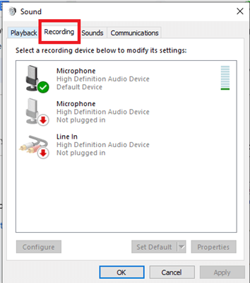 点击录制选项卡,然后选择要使用的麦克风。右键单击麦克风,然后选择属性。