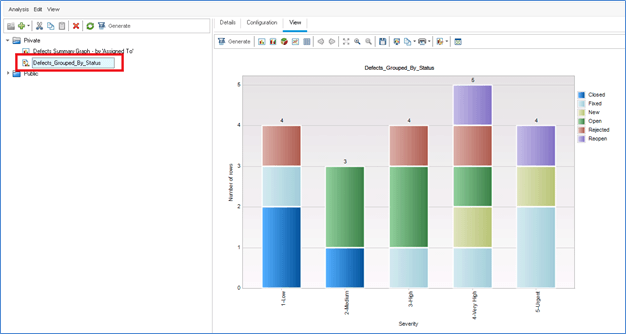 步骤 3) 创建的图表允许用户根据他们的需求更改配置。我们选择了 Y 轴上的缺陷计数并根据“状态”进行分组。
