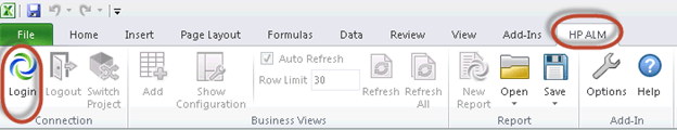步骤 5) 打开 Microsoft Excel,您会发现一个名为“HP ALM”的新选项卡。选择“HP-ALM”并点击“登录”。
