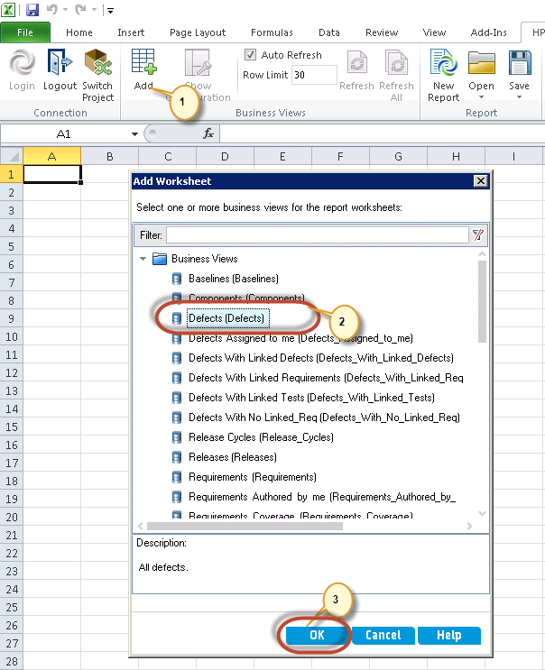 - “添加工作表”对话框打开。选择“缺陷”,因为我们要生成“高”/“非常高”和“严重”缺陷报告。