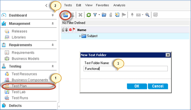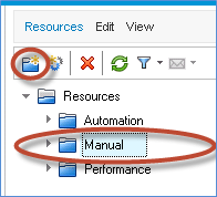 步骤2)通过点击“新建文件夹”图标创建一个“新建文件夹”,如下所示。新建文件夹对话框打开。让我们为所有三种测试类型创建测试资源,即手动、自动化和性能。