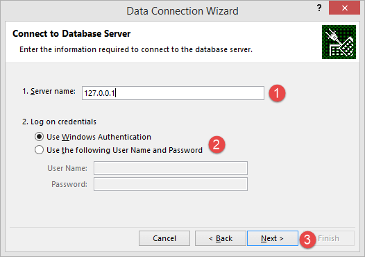 - 输入服务器名称/IP 地址。在本教程中,我将连接到 localhost 127.0.0.1