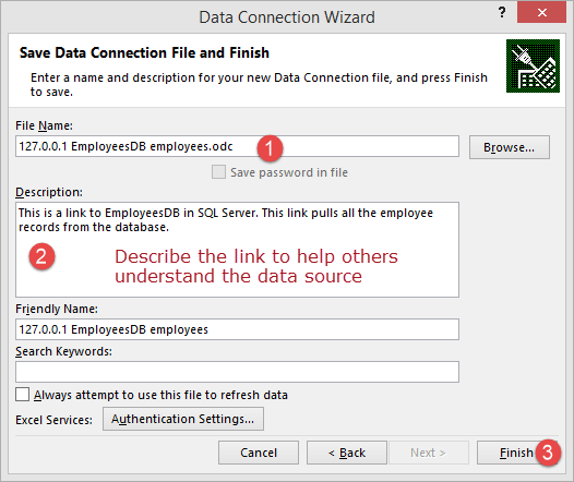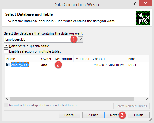 这将打开一个数据连接向导,用于保存数据连接并完成连接到员工数据的过程。