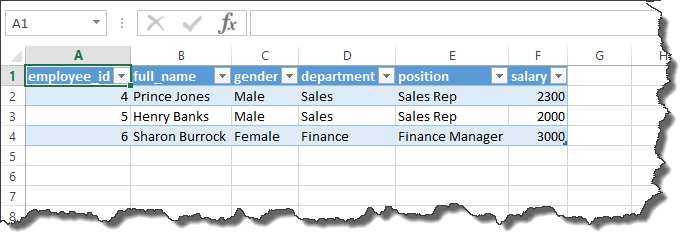 ('4','Prince Jones','Male','Sales','Sales Rep',2300)