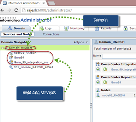 例如,在下面的屏幕截图中,您可以看到域窗口下创建了名为“Domain_Rajesh”的文件夹,其中我们创建了一个名为“node01_rajesh”的节点和名为“guru99 integration services”的服务。