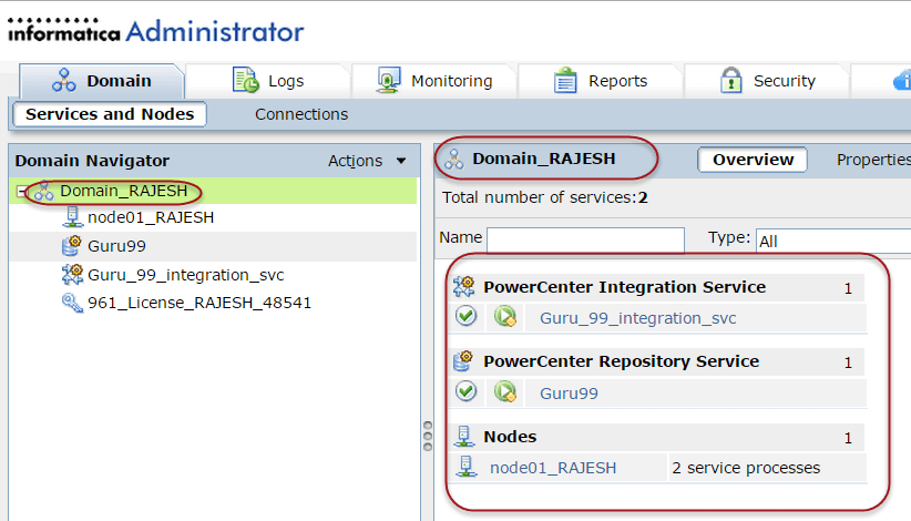 如前所述,域是 Informatica 中基本的管理控制。它是包含集成服务、存储库服务和各种节点等其他服务的父实体。