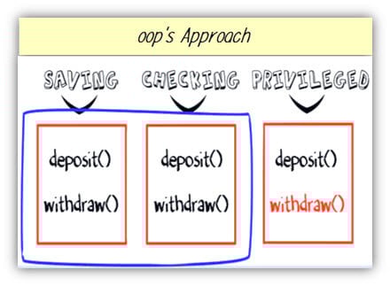 OOP 方法:但是,使用面向对象的方法,您将创建一个具有独特存款方法实现的新类(如下面的图像中突出显示的红色部分)。因此,即使结构化编程一开始看起来是一种简单的方法,但从长远来看,OOP 方法更胜一筹。
