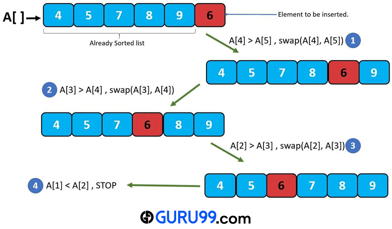 A[N-1] is the element to be inserted in the sorted sublist A[0..N-2]. For i = N-1 to 1: if A[i] < A[i-1], then swap A[i] and A[i-1] else Stop