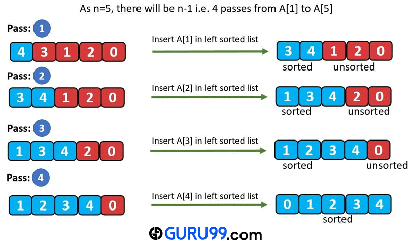 上面讨论的插入操作是插入排序的基石。插入过程应用于每个元素,最后,我们得到排序后的列表。