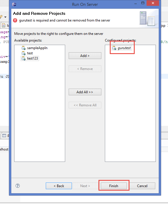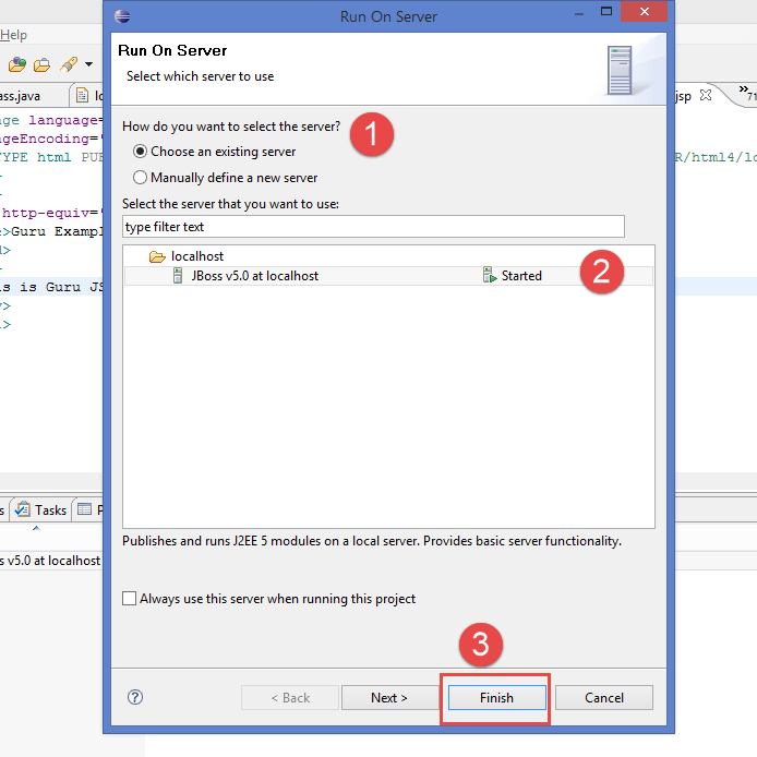 - 服务器名称将在此处添加为 JBoss v5 at localhost(已在上一步中选择)。