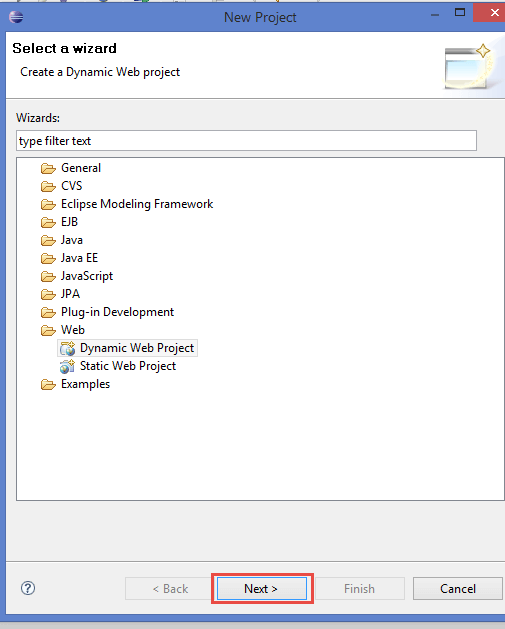 步骤 1) 我们可以通过右键单击项目资源管理器来创建动态 Web 项目,然后会看到以下窗口。