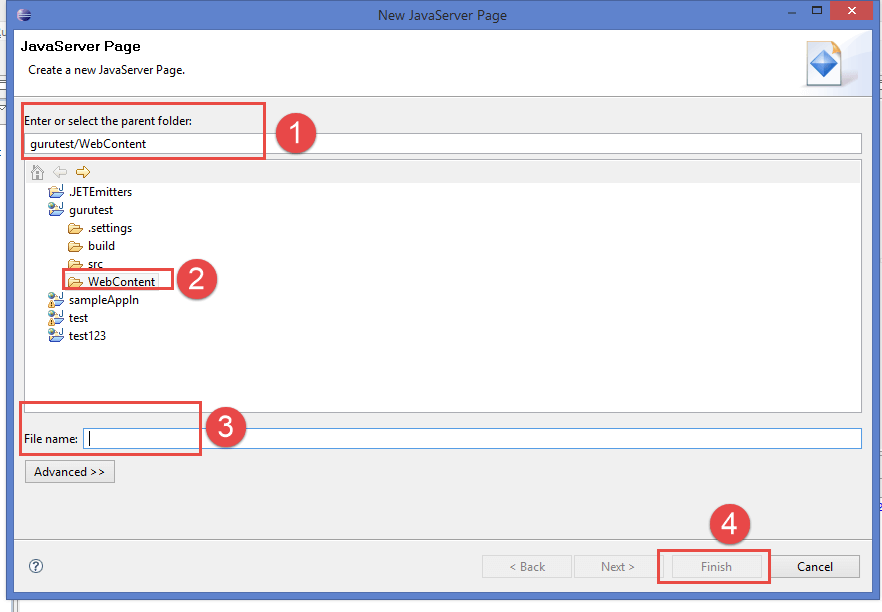 文件名指定为 guru_example.jsp,然后单击下一步,再单击完成。