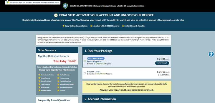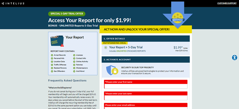 讨论了不同的定价选项后,您可能想知道,Intelius 是否免费?Intelius 提供1.99 美元的 5 天试用期,让您可以访问其所有功能并无限制地生成报告。