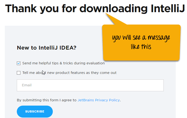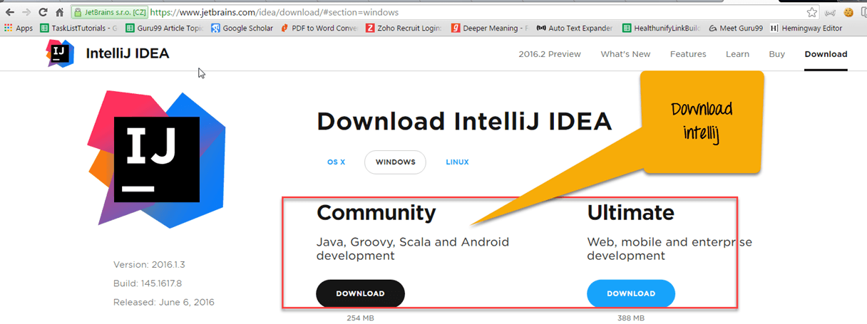 步骤 1) 要下载 IntelliJ,请访问 jetbrains 网站。这里我们选择了“社区”版本。您可以选择“终极”版本用于移动、Web 和企业开发。