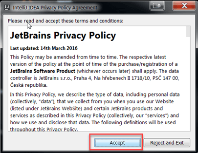 步骤 10) 在上一步中点击“确定”按钮后,它会要求您同意 Jetbrain 隐私政策。点击“接受”按钮。