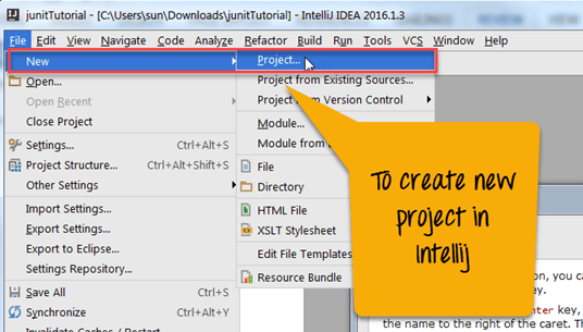 步骤 1) 启动您的 IntelliJ IDE 并创建一个新项目。选择 文件 -> 新建 -> 项目