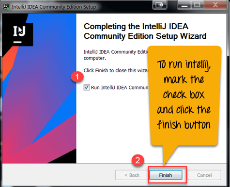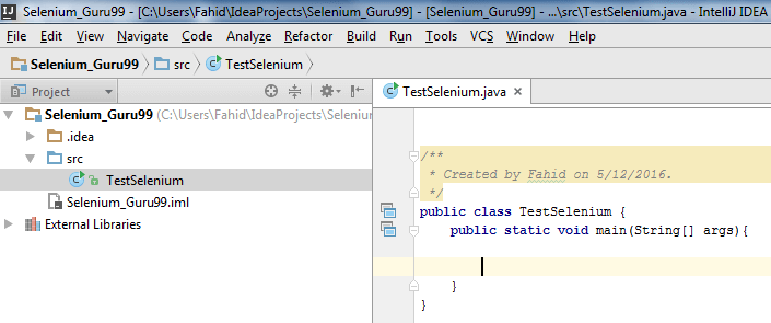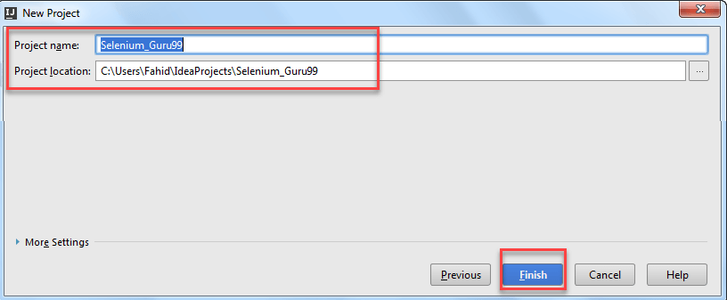 步骤 2) 在上一步中,当您点击 -> 下一步时。将打开一个新屏幕。在此屏幕中,输入项目名称。在我们的例子中,我们已命名为 Selenium_Guru99。然后点击 -> 完成。您的项目已在 IntelliJ 中创建。