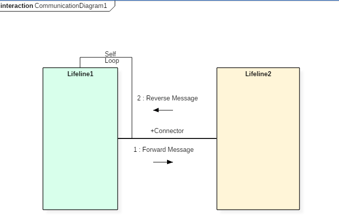 上面的协作图表示法包含了协作图中使用生命线以及连接器、自环、向前和向后消息。