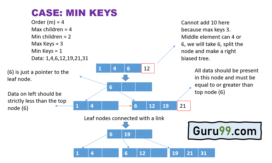 - 右侧和左侧的其他链接节点可以腾出任何条目,然后将它们移动到叶子节点。如果未满足这些条件,则应将叶子节点及其链接节点合并到树层级结构中。