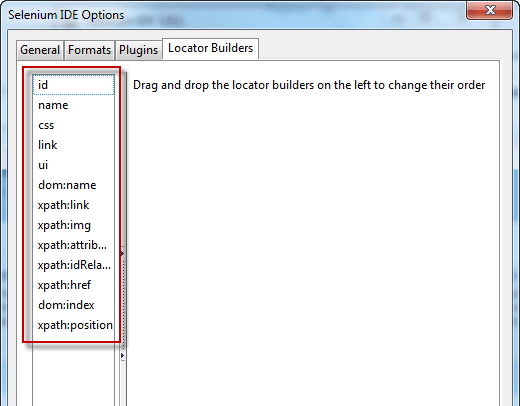 - 定位器构建器。 这是您指定在录制时生成定位器的顺序的地方。定位器是告诉 Selenium IDE Selenese 命令应作用于哪个 UI 元素的方式。在下面的设置中,当您单击具有 ID 属性的元素时,该元素的 ID 将用作定位器,因为“id”是列表中的第一个。如果该元素没有 ID 属性,Selenium 将接下来查找“name”属性,因为它是列表中的第二个。该列表会一直持续下去,直到找到一个合适的。