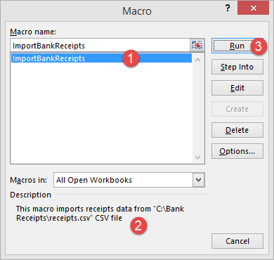 在保存工作簿之前,我们需要删除导入的数据。我们将这样做是为了创建一个模板,每次有新收据并想运行 ImportBankReceipts 宏时,我们都可以复制该模板。