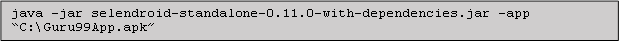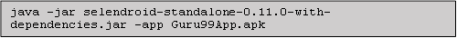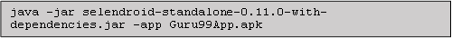 在上面的命令中,Selendroid 会根据“C:\Guru99App.apk”自动查找二进制文件,以获取被测应用程序的信息。
