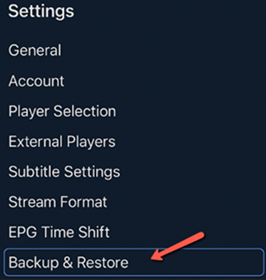 步骤 2) 现在,导航到菜单中提供的 **Backup & Restore (备份与恢复)**。然后根据您的需求选择备份或恢复。它将备份您的内容、EPG 等。另一方面,恢复允许您在新的 Fire TV 上启动时恢复您之前的 UI 和设置。