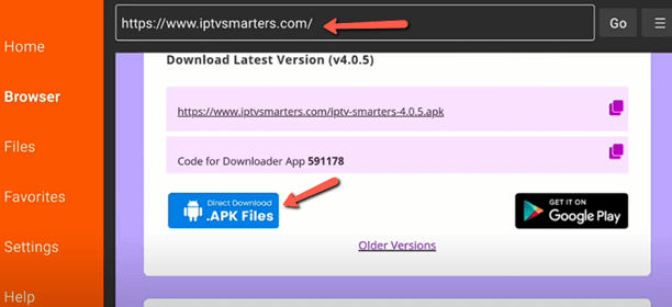 这将带您到其网站。在那里,找到 **Download APK Files (下载 APK 文件)** 并获取最新版本的 IPTV Smarters Pro,然后点击 **Go (前往)**。