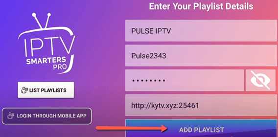 步骤 2) 现在,为您的播放列表输入一个名称,然后将 IPTV 提供商在凭据字段中发送的详细信息添加到其中。详细信息包括用户名、密码和 Xtreme Codes API URL。添加后,只需点击 **Add Playlist (添加播放列表)**。