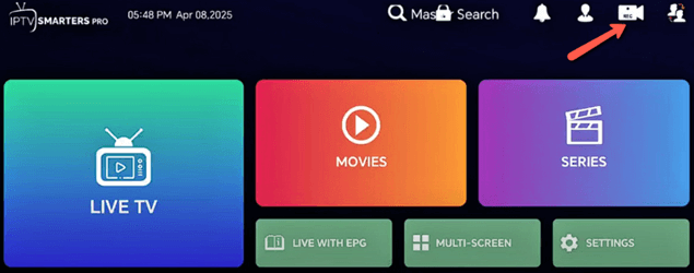 步骤 1) 打开 IPTV Smarters Pro 应用程序,然后访问上方提供的 **Record (录制)** 或摄像机图标选项。
