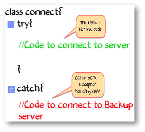 在我们的示例中,TRY 块将包含连接服务器的代码。CATCH 块将包含连接备用服务器的代码。如果服务器在线,将忽略 CATCH 块中的代码。如果服务器离线,则会引发异常,并执行 catch 块中的代码。