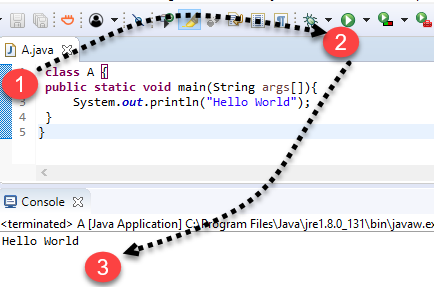 步骤 7) 如果您将相同的代码复制粘贴到 Eclipse 这样的 IDE 中,编译和执行只需点击按钮即可完成。使用 IDE 方便且能提高您的效率,但由于您正在 学习 Java,我们建议您在执行简单的 Java 程序时坚持使用记事本。