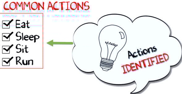 接下来,列出这些狗的共同行为,如睡觉、坐下、吃饭等。所以这些将是我们软件对象的动作。