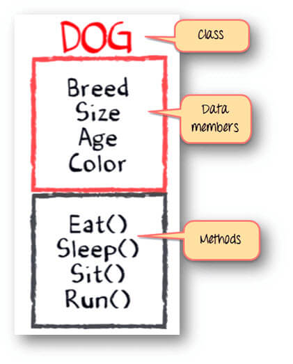 - 数据成员或对象– 大小、年龄、颜色、品种等。