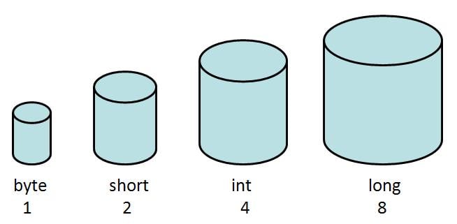 byte (1 byte) short (2 bytes) int (4 bytes) long (8 bytes)