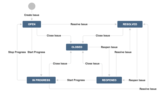 JIRA 工作流是问题在其生命周期中所经历的一组状态和转换。一旦问题被创建,工作流包含五个主要阶段。