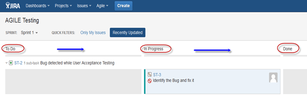 敏捷或 Scrum 方法通常由开发团队使用,他们遵循产品未来版本规划功能的路线图。敏捷遵循与其他 JIRA 方法相同的路线图来跟踪其问题,即待办 -> 进行中 -> 完成,如下面的屏幕截图所示,我们有一个问题在待办中,第二个在进行中。一旦“进行中”的问题解决,它将移至“完成”状态,同样,“待办”中的问题将移至下一阶段“进行中”。