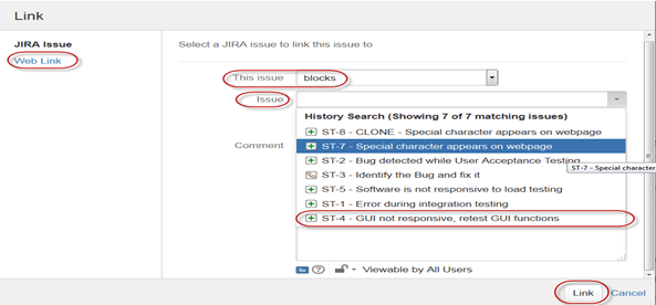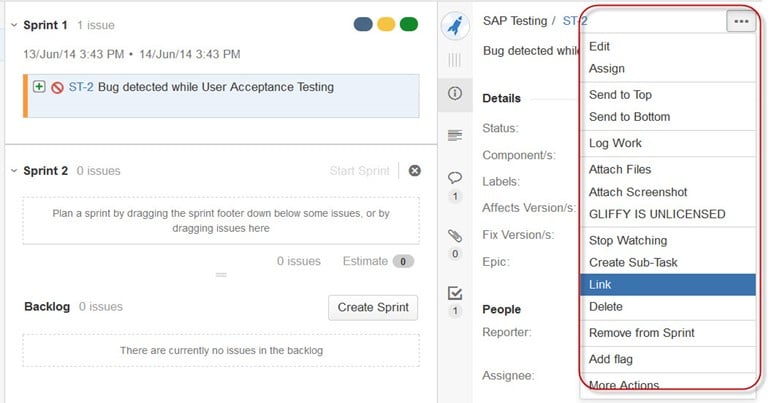 JIRA 中还有一个有用的功能是链接,问题链接允许您在相同或不同 JIRA 服务器上的两个现有问题之间创建关联。如屏幕截图所示,我们已将当前问题“ST-6 下拉菜单不工作”与另一个问题“ST-4 GUI 无响应 - 重新测试 GUI 功能”链接起来。